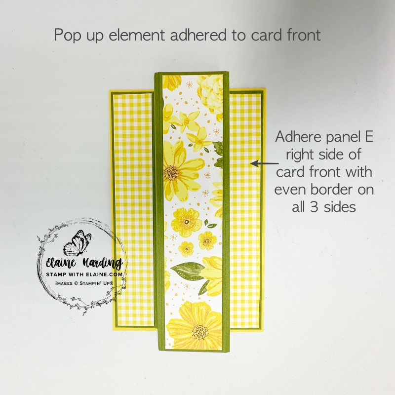 • Flip card stock over and apply adhesive to panel E and adhere to right side of card front leaving an even border on all three sides