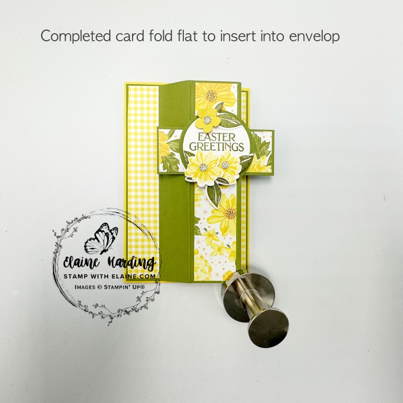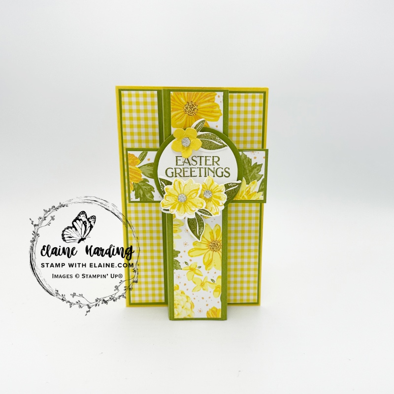 Easter with Floral Delight. Floral Delight is a Suite Collection which you can find on pages 33 – 37 of the January – April 2025 Mini. Spring is upon us, and often times we associate the vibrant yellows of daffodils with Easter. There aren’t any daffodils in the Floral Delight Suite, but the colours in the Designer Series Papers are mostly yellow with old olive and in the vellum pack, hints of blue. That spells Easter, right? So here’s what I made. Hope you like it.