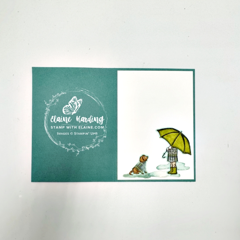 I used Stampin’ Blends for colouring the dog in Pecan Pie, the umbrella and wellies in Old Olive, the trousers in Crumb Cake, and hands in Petal Pink.