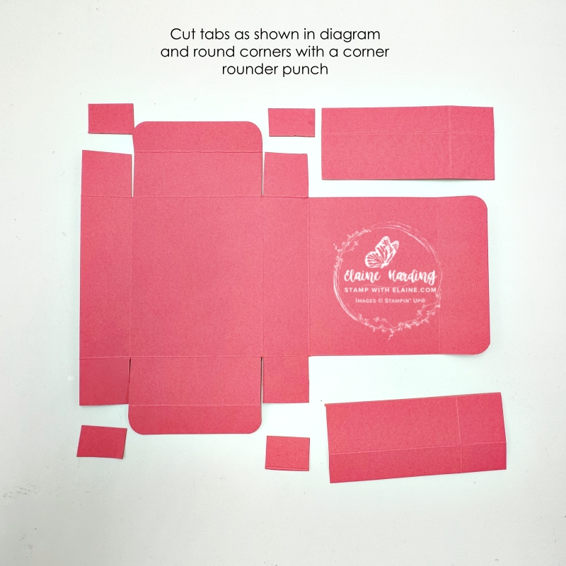 - Cut Strawberry Slush box base 10 ¾” x 8 ¼” (27.3 cm x 21 cm). On long side score at 1 ¼”, 4 ¾”, 6”, 9 ½” (3.2 cm, 12.1 cm, 15.2 cm, 24.1 cm). Rotate card stock so that short side is on top and score at ¾”, 2”, 6 ¼”, 7 ½” (1.9 cm, 5 cm, 15.8 cm and 19.1 cm)
