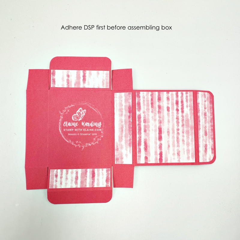 The DSP (Designer Series Paper) I used is the 2025-2027 In Color 6″x 6″ (15.2 x 15.2 cm) new design. Its best to use a non-directional pattern for the box but because I wanted to add the jars as decorative elements, I didn’t want a busy floral pattern so I used the stripes instead.