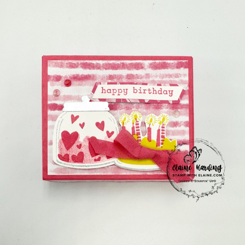 Cute treat box – Sweet Jar. Here’s another Online Exclusive that might tickle your fancy. It’s called Sweet Jar and the bundle consists of the stamps and the Sweet Jar builder punch. I thought I’d make a box to hold some candy just for a change, and I used velcro as a closure.
