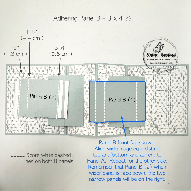 - Refer to left picture above. Both panel B has 3 score lines. Apply adhesive on the side with the single ¾” score line. Flip panel so that DSP is face down and equidistant from the top and bottom on Panel A. Remove backing tape, align Panel B (1) as pictured and adhere to Panel A.