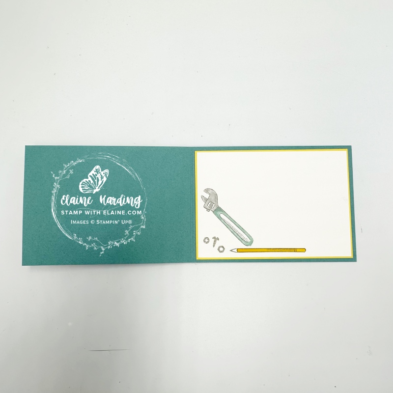 2. Stamp the images from Trusty Tool stamps in Smoky Slate ink. Colour with Stampin’ Blends in Lost Lagoon and Daffodil Delight.