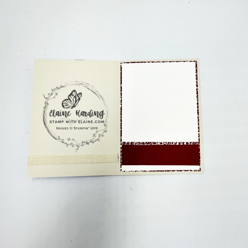 - Inside card : cut Cherry Cobbler strip 1″ x 3 ¾” (2.5 cm x 9.5 cm).