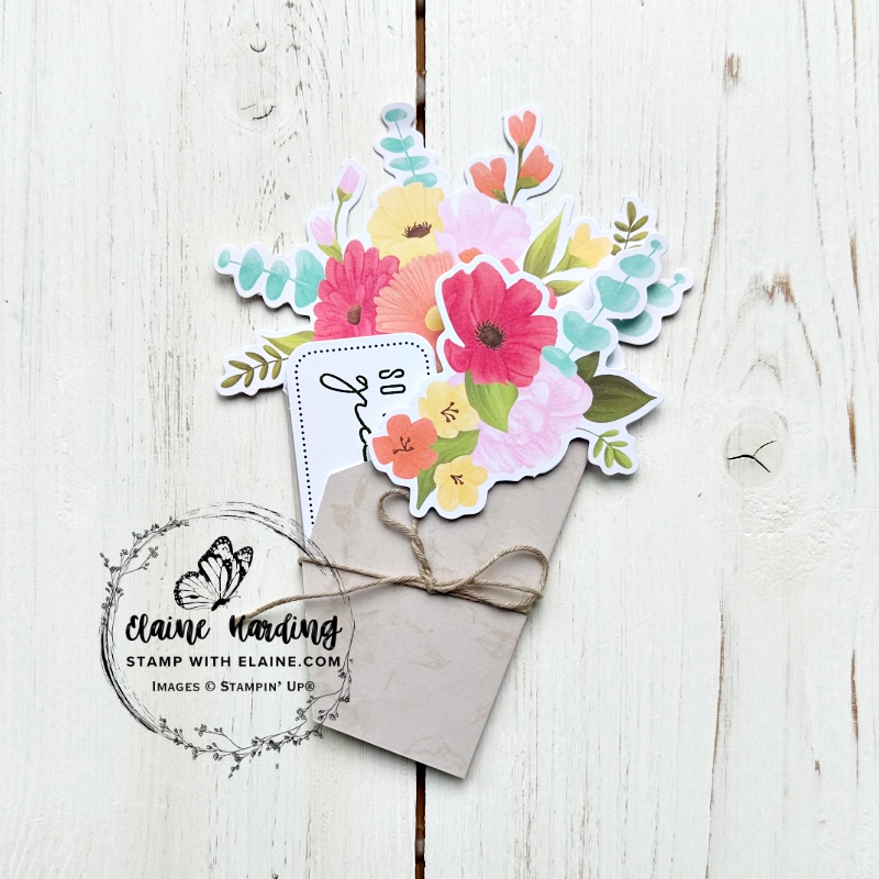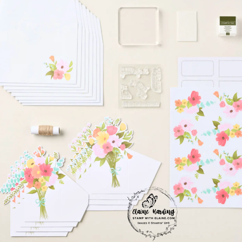 Here are the kit contents – coordinating envelops, stamping block, dimensionals, a Mossy Meadow stampin’ spot, Linen thread, photopolymer stamps, labels, pre-cuts and 4 each of the bouquet cards in 2 designs.
