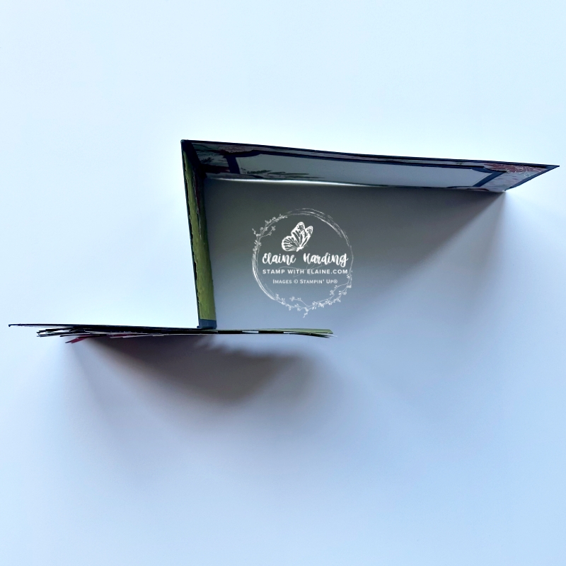 - Adhere 5 ½” x 3 ⅞” (14 cm x 9.8 cm) piece of DSP to the inside right of card base leaving an even border on all 4 sides.