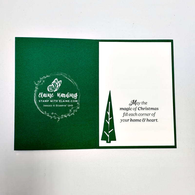 7. Inside card – remove backing tape and adhere Shaded Spruce tree and stamp sentiment form Words for the Season in Shaded Spruce, then adhere Basic White layer to inside of card.
