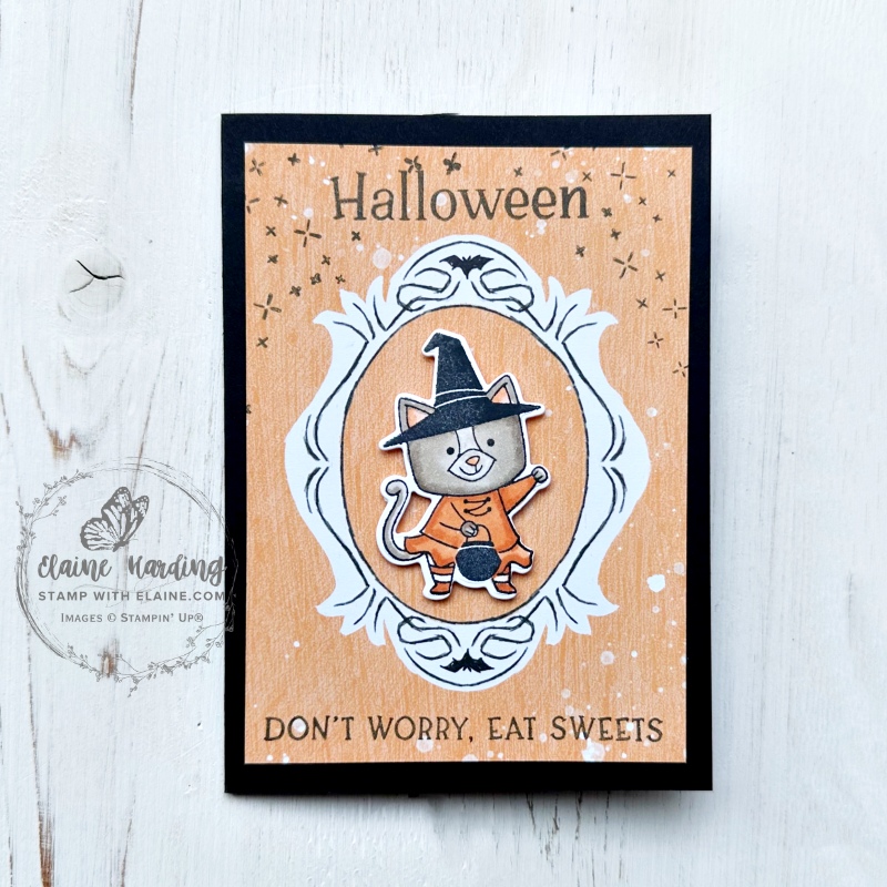 Framed Halloween card – welcome to week 3 of my 6 week Halloween Countdown Series. Here’s another quick, easy Halloween card. This is the third piece from the Spooky Halloween DSP sheet and I stamped the little cat wearing the witch hat and die cut it from the Spooky Halloween Dies. I also featured some of the extra dies like the house and pair of bats.