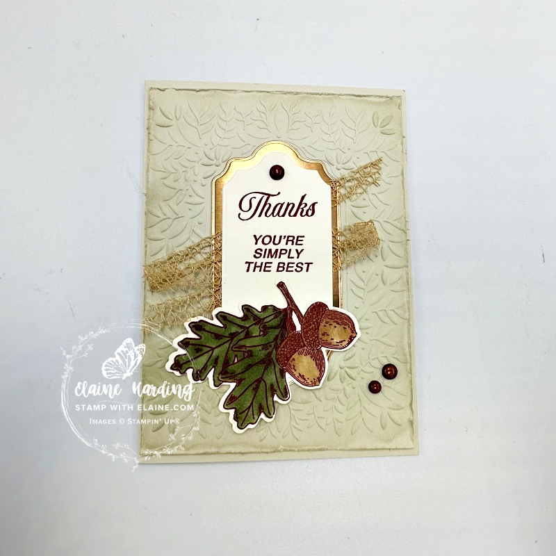Embossed Fall card – Peaceful Embossing folder. The Peaceful Embossing folder is actually from the Peaceful Garden Suite Collection, but you can use it for other types of card too. The embossing folder has a recessed fancy shape centre which isn’t embossed so that you can stamp on it or add die cut pieces which coordinate with it. I also used the Peaceful Embossing Dies.