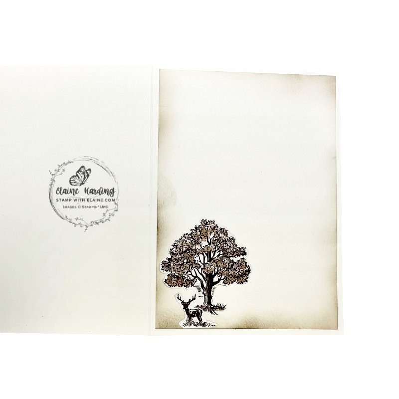 - Stamp tree in Pecan Pie from the Autumn Trees stamp set on a scrap of Very Vanilla card stock. Colour the trunk and branches with light Pecan Pie Stampin’ Blend and Mossy Meadow Stampin Blends. Die cut tree with Autumn Trees die. Also stamp deer, colour and die cut. Set aside.