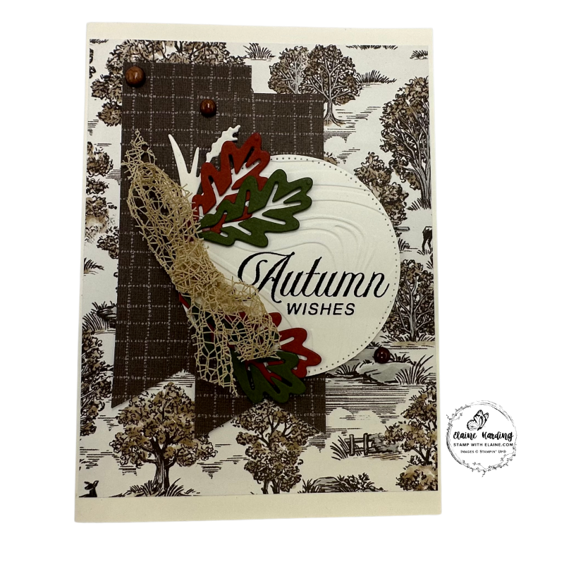 - Stamp “Autumn Wishes” on a scrap of Very Vanilla and die cut with 2nd largest circle from Stylish Shapes dies.