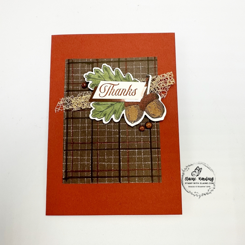 - Partially stamp the acorn and leave in upper right corner with Cajun Craze ink.