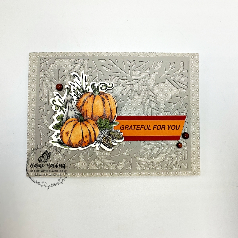 Thanksgiving card – Amber Autumn. Amber Autumn stamps and dies are from the Autumn Toile Suite Collection in the September-December 2025 mini catalogue. It’s one of the Mega suites which comprises 2 stamp bundles with ribbon, embellishments, patterned paper as well as Earthen Toned Metallic Specialty paper to coordinate. You’ll find it on pages 39 -43 with numerous pictures to give you ideas on what you can make with this suite.