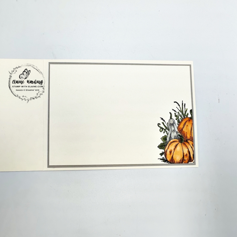 4. Stamp trio of pumpkins on Very Vanilla scrap with Tuxedo Black Memento ink. Colour image with Stampin’ blends i.e., leaves in Mossy Meadow, large pumpkins in Pumpkin Pie, tall slim pumpkin in Gray Granite as well as the husks on the corn and Daffodil Delight on the corn itself. Then colour with Clear Wink of Stella on pumpkins to make it pop. Sadly it’s not visible in the photos, but they do sparkle in real life!