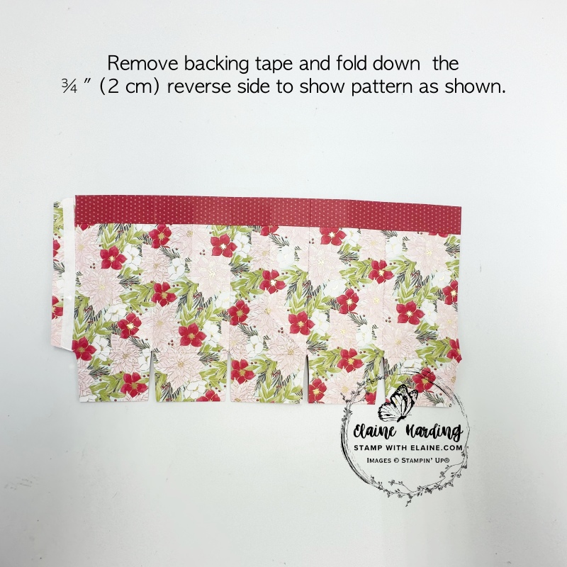 - Burnish all the score lines. then orient card stock so that the narrow tab is on the right and cut the bottom panel as pictured along the 2″, 4″, 6″, 8″ and 10″ (5, 10, 15, 20 and 25 cm).