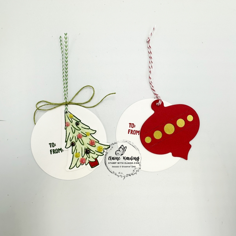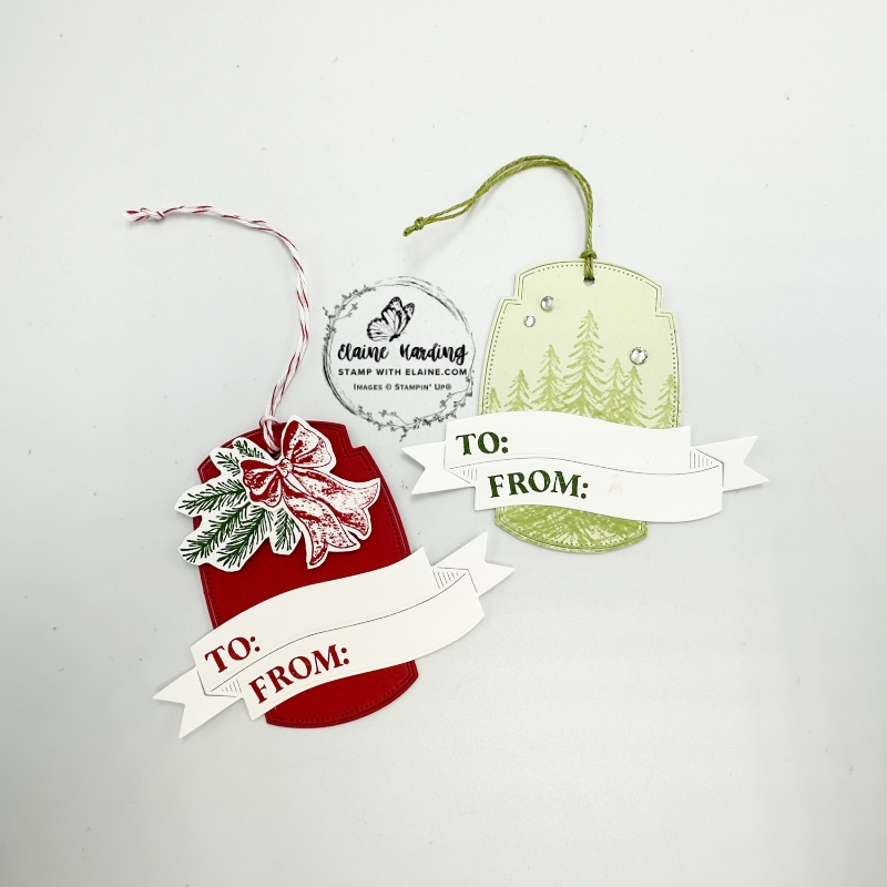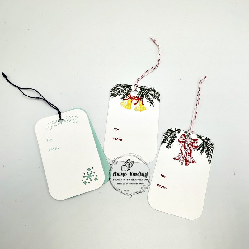 - For the remaining two labels, stamp as shown and thread Bakers twine through to finish. Inks used are Mossy Meadow for the pines, Daffodil Delight for the bells, Real Red for the bow.