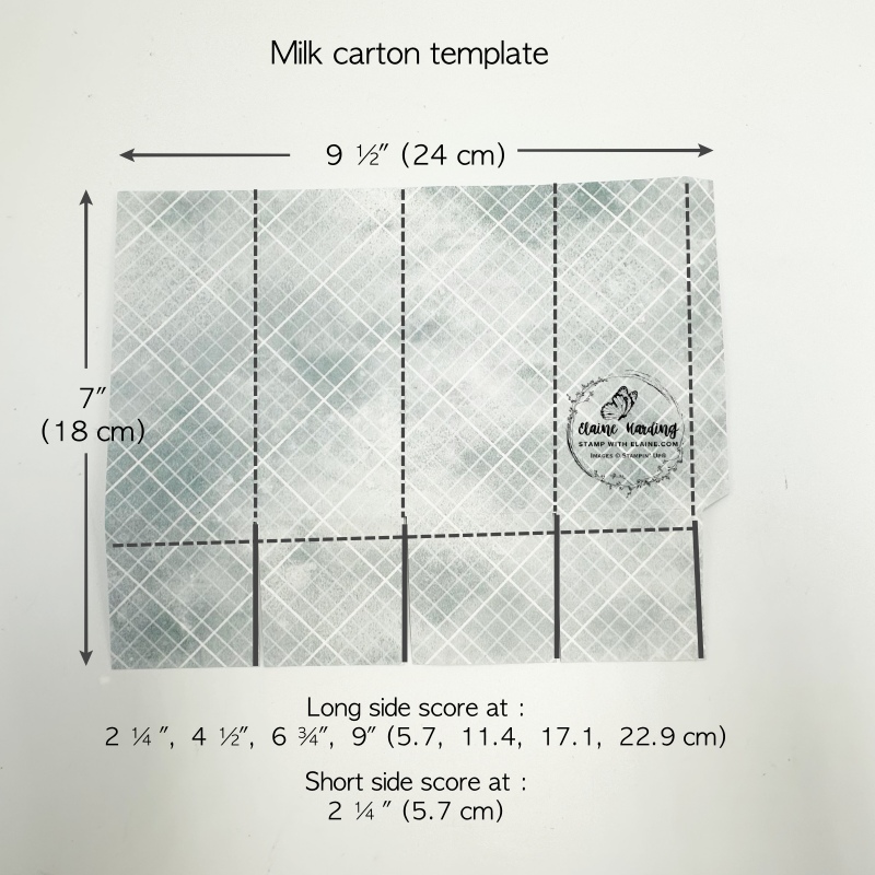 - Long side score at 2 ¼”, 4 ½”, 6 ¾”, 9″ (5.7, 11.4, 17.1, 22.9 cm)