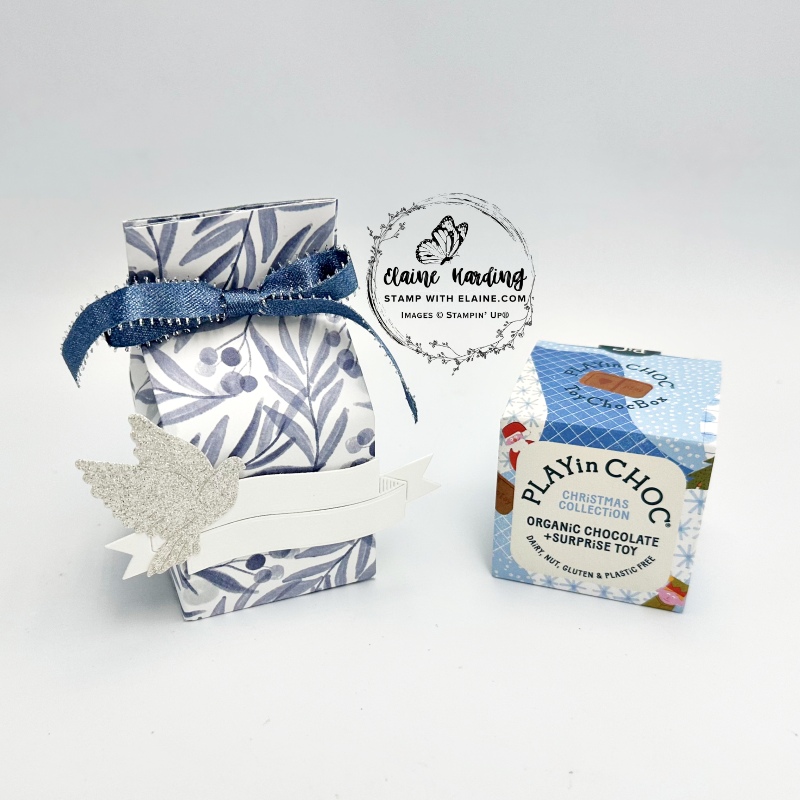 I discovered these little boxes of chocolate which had a surprise toy inside that you have to assemble yourself, but the boxes were blue. As I don’t have a blue table cloth, but only a green one for Christmas, then green packaging it was! However, I did include one made in blue to match the box of chocolate with products from the Peaceful Garden Suite Collection.