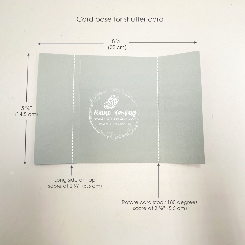 - Cloud Cover card stock card base : 5 ¾” x 8 ½” (14.5 cm x 22 cm). Long side on top score at 2 ⅛” (5.5 cm).