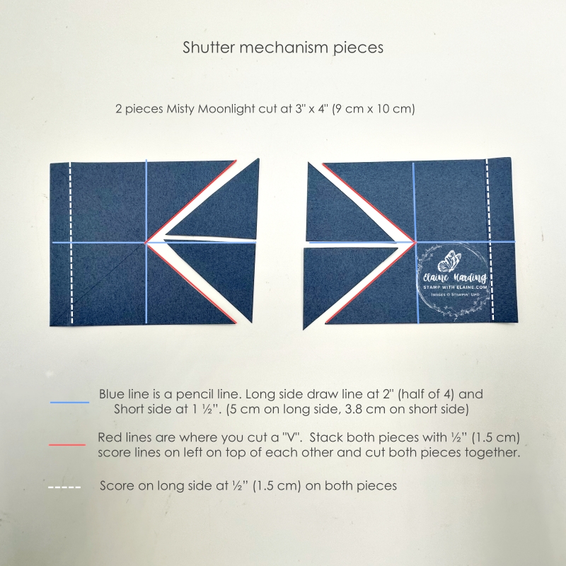 - Cut 2 pieces Misty Moonlight pieces 3 ½” x 4” (7.5 cm x 10.2 cm). On long side, score each piece at ½” (1.5 cm)