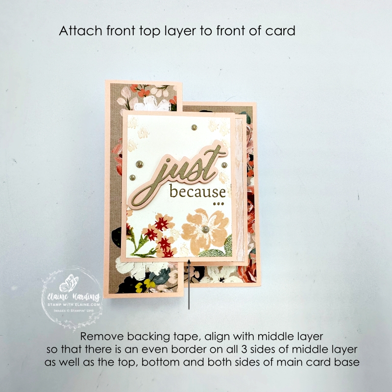 - Remove backing tape, align layer with top, bottom and side of Middle layer as well as the top, bottom and both sides of the main card before adhering.