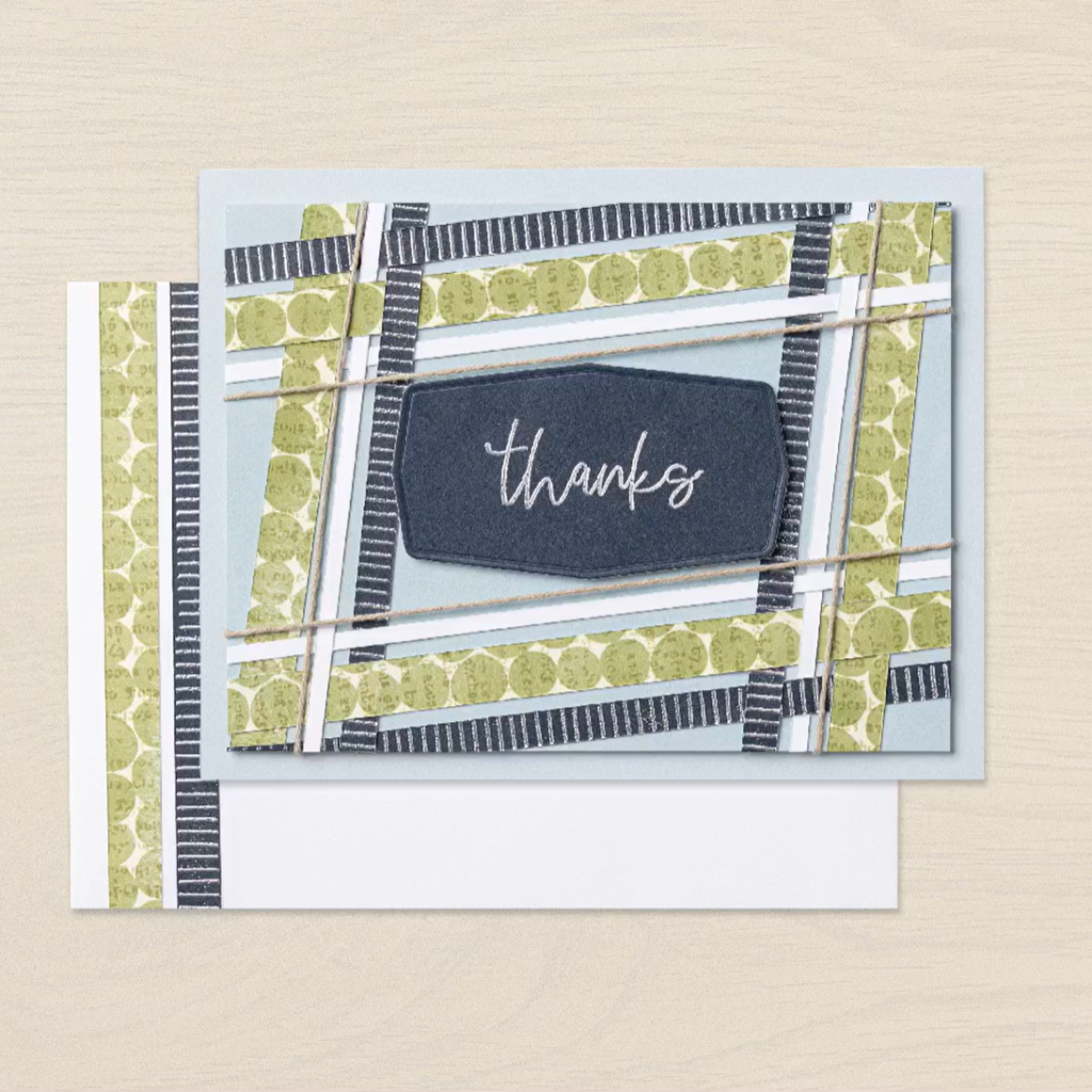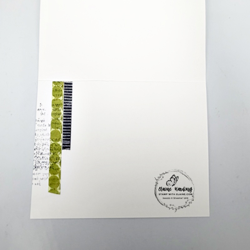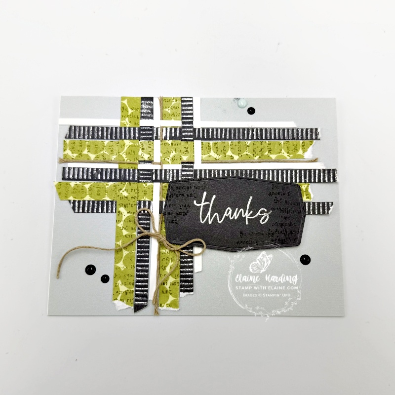 On the Old Olive patterned paper, we stamped text in Crumb Cake ink. I added some embellishments because I’d accidentally smudged my card with ink.