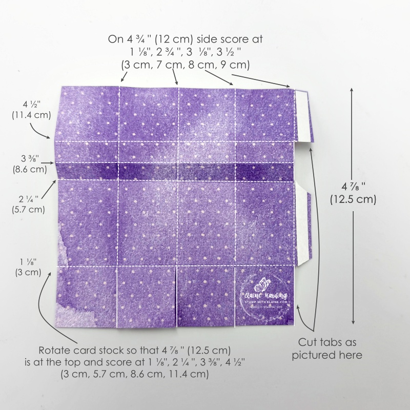 - With 4 ¾” side at the top score at 1 ⅛”, 2 ¾”, 3 ⅛”, 3 ½” (3 cm, 7 cm, 8 cm, 9 cm)