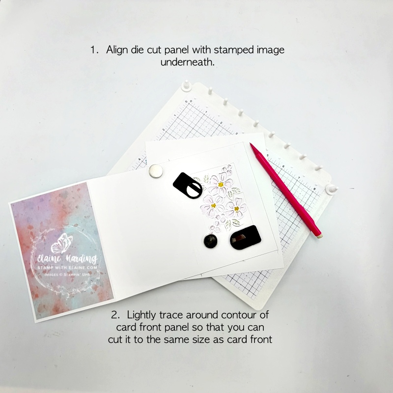 2. Align front panel with stamped image and use low tack tape to secure it. Use a pencil to lightly trace around perimeter of card as shown in picture below.