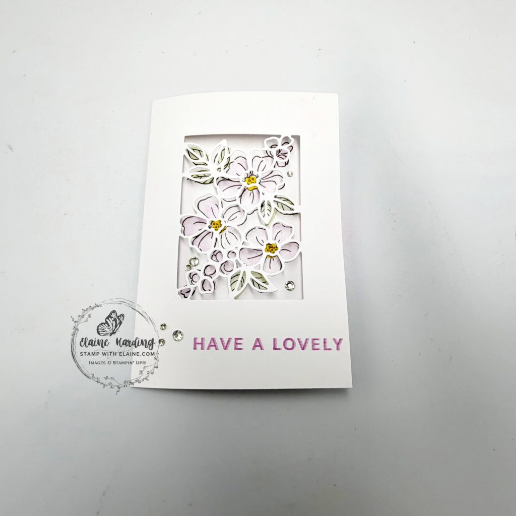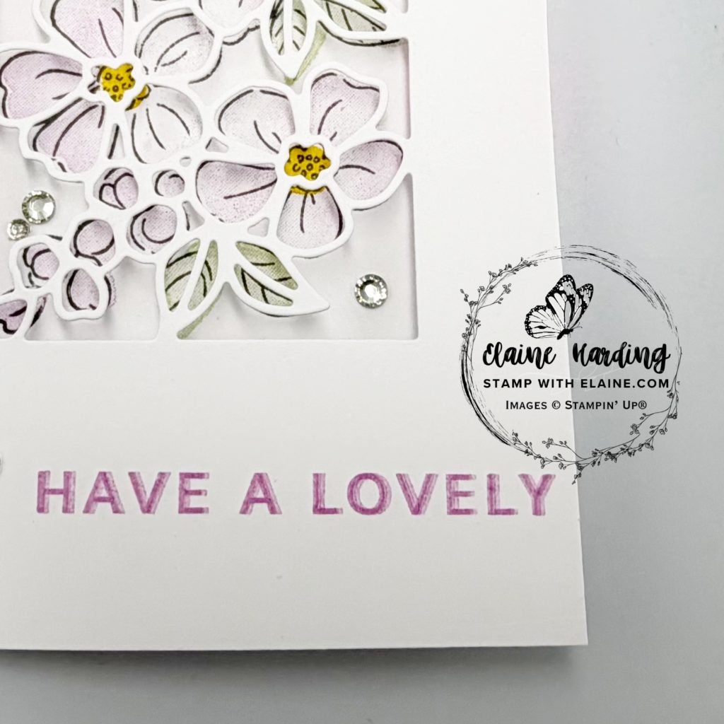 1. Lastly stamp “Have a lovely” on bottom right of front of card with Fresh Freesia ink.