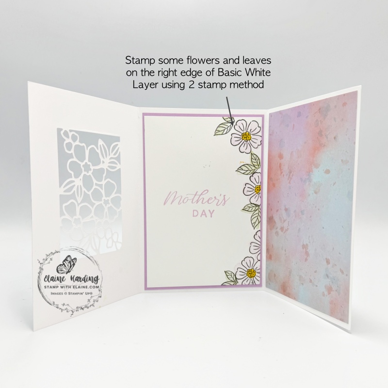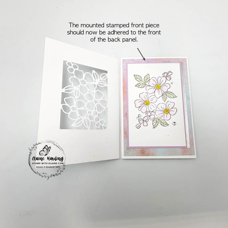 1. Align stamped layer with die cut Fragrant Floral front panel piece – pictured on the left above. Carefully open card so that stamped piece is face down and the mat layer on the reverse is face up. Apply adhesive on this piece.