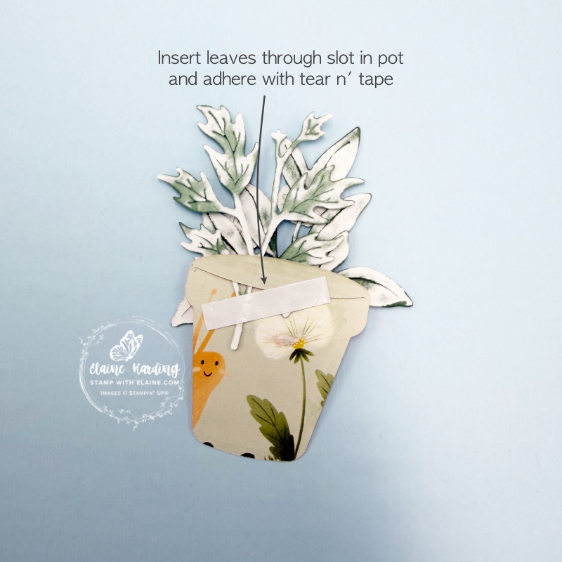 - Insert leaves into 3rd flower pot, flip over to the back and apply tear n’ tape to secure leaves. Flip back to right side and insert into middle flower pot. Ensure the leaves are within the card.